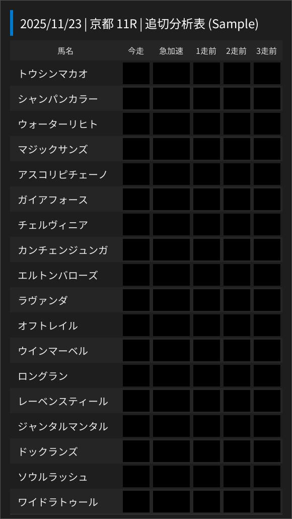 追切診断 お気に入り 会員限定 マイルチャンピオンシップ(2025年)追切診断 2025.11.21 マイルチャンピオンシップ(2025年)の特別登録馬の直近追切ランク表を無料会員限定で公開しています。 ※追切ランク:S>A>B>C>D>E>Fで評価。「-」はレース間隔が詰まっているなどで追切が実施できていない馬 ※急加速:著書「追切インサイダー」で採用されている急加速ロジックをベースに注目馬に▲▲▲マークを付与 この記事は会員限定の記事です。記事の続きを読むには会員登録をしてください。 会員登録はこちら ログインして続きを読む トップページへ戻る